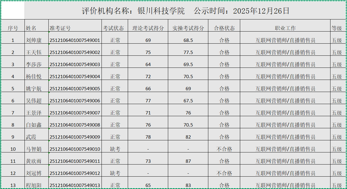 查看详情 >银川科技学院继续教育学院于2025年12月10日进行了互联网营销师初级职业技能等级认定考试,现将考试成绩予以公示,银川科